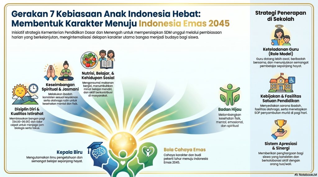 Kesimpulan Strategis Gerakan Tujuh Kebiasaan Anak Indonesia Hebat adalah strategi transformasi karakter yang holistik dan terintegrasi. Dengan mengubah disiplin harian menjadi identitas melalui ekosistem pendidikan yang mendukung, kita secara sistematis sedang membentuk generasi yang sehat, cerdas, dan tangguh—modal fundamental untuk menjemput kejayaan Indonesia di panggung dunia pada tahun 2045.